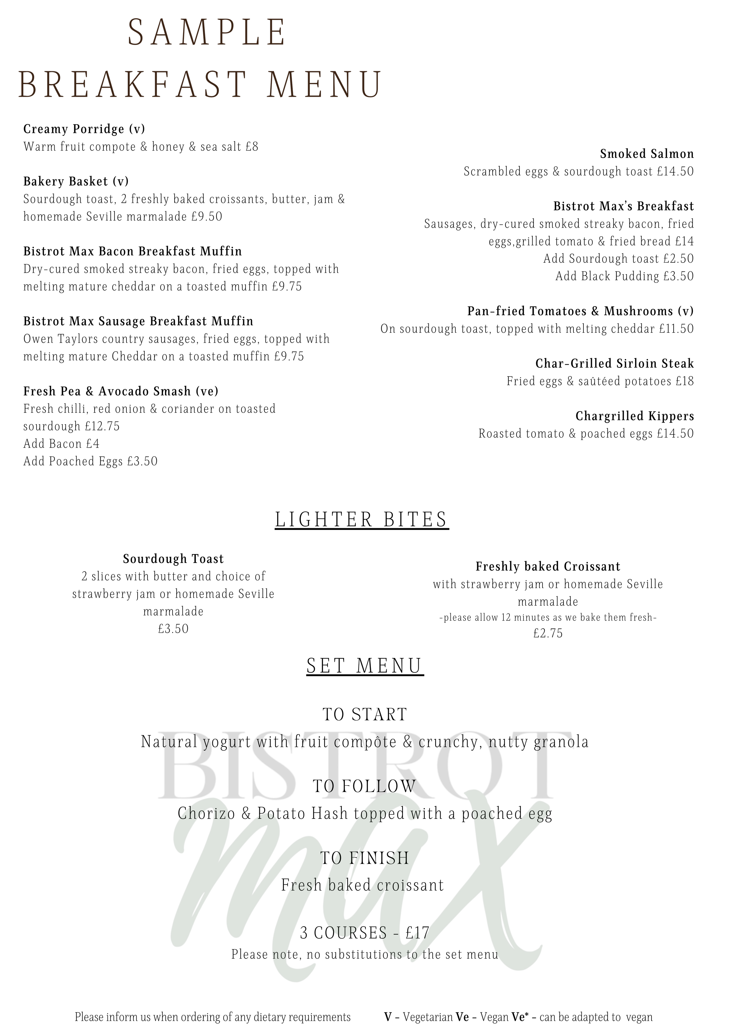 Please note this is as sample breakfast menu.We cannot guarantee any item will be available on your visit.