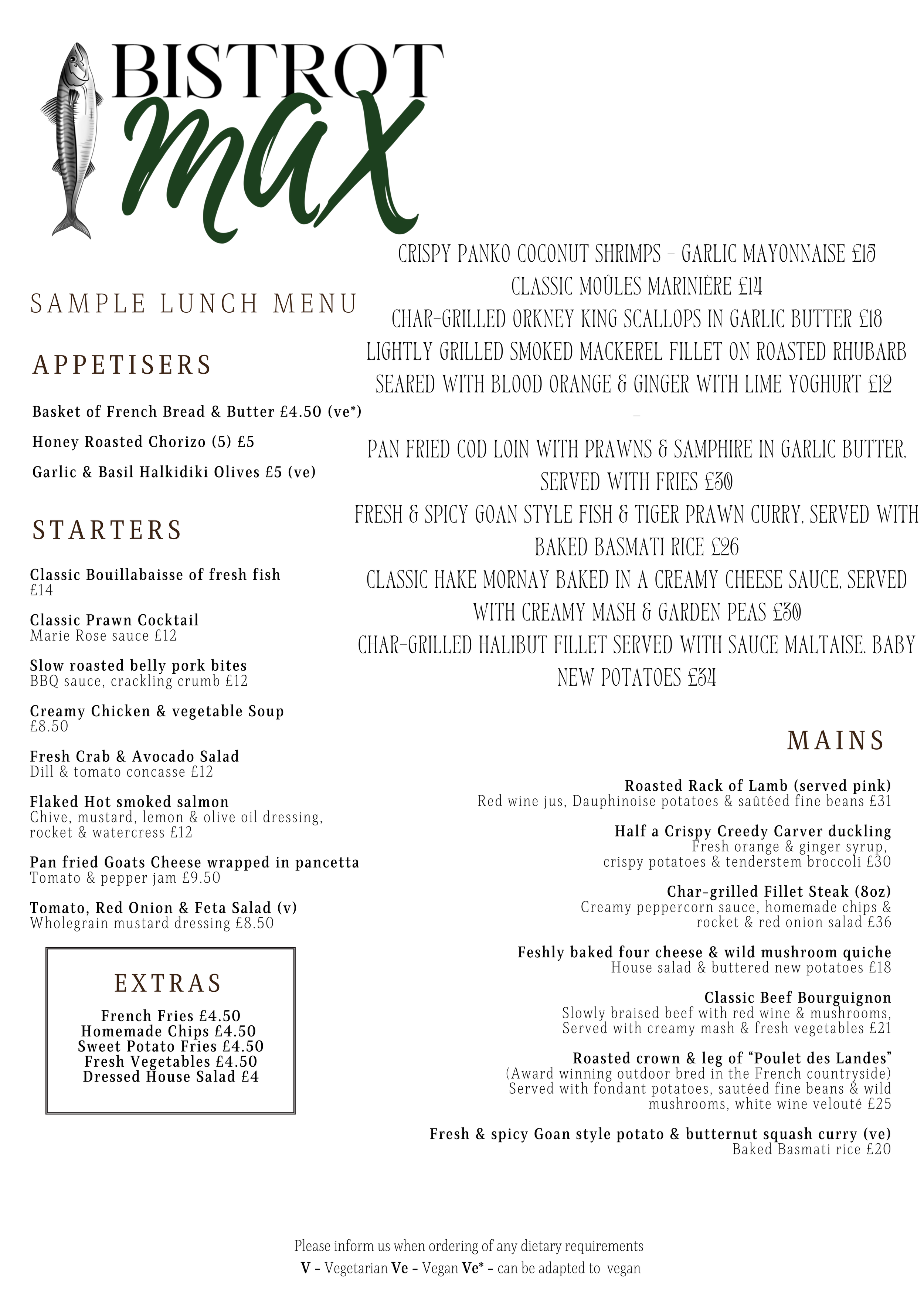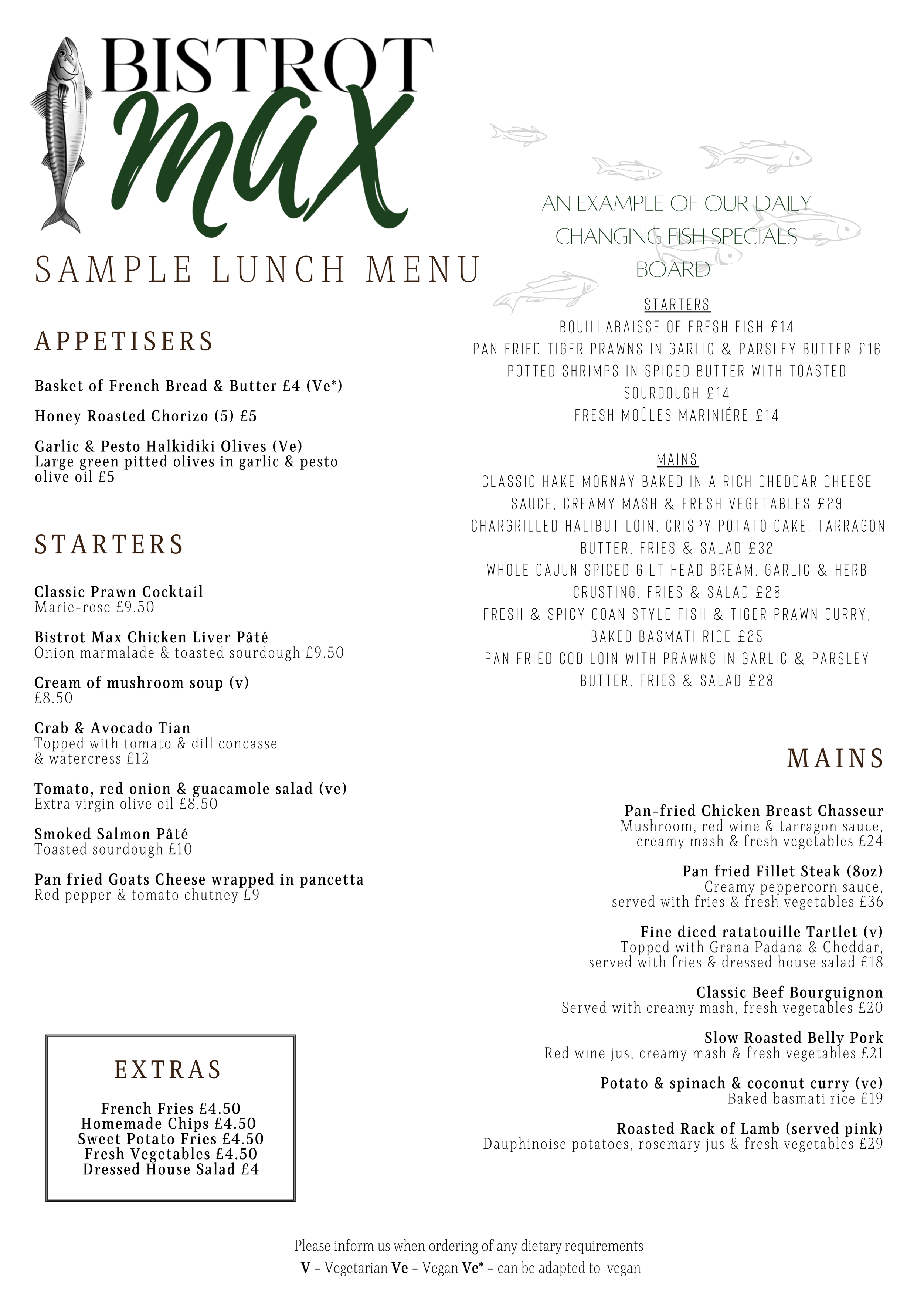 Please note this is as sample lunch menu. We cannot guarantee that any item will be available on your visit. We will also have a specials board available during lunch service & Friday evenings